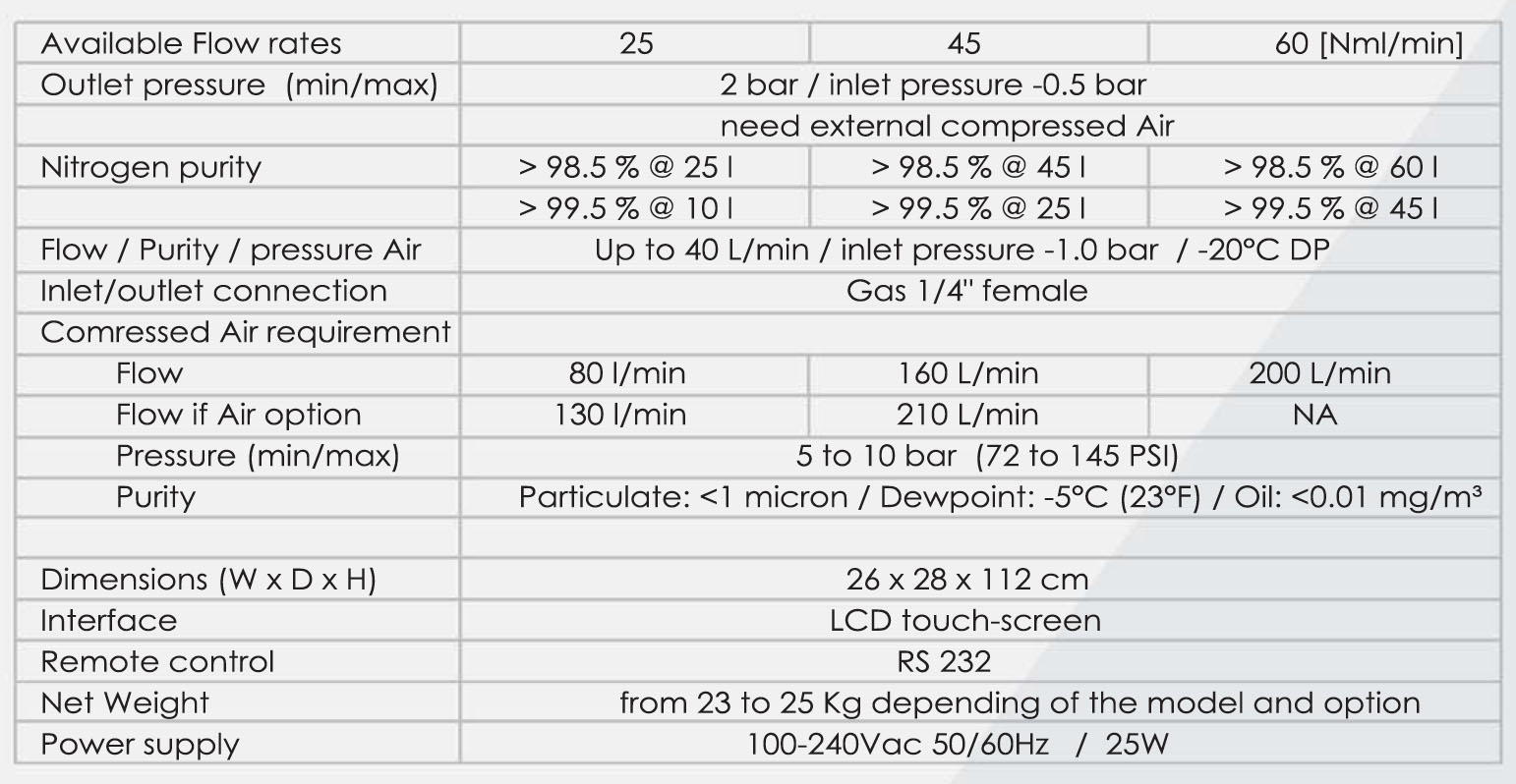 La serie NitroGen Mistral ONE son generadores de nitrógeno de membrana. Están diseñados para transformar el aire comprimido estándar en un suministro seguro y regulado de Nitrógeno con una pureza de hasta el 99,5%. Un canal opcional puede proporcionar hasta 40 L / min de aire comprimido, seco y regulado.